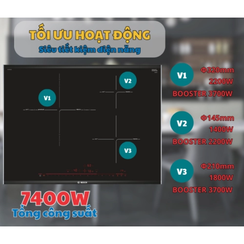 Với tổng công suất lên đến 7400W, Bosch EUC.PID775DC1E Series 8 đảm bảo khả năng nấu nướng nhanh chóng và hiệu quả cho mọi món ăn. Sản phẩm được trang bị ba vùng nấu với công suất và kích thước khác nhau: