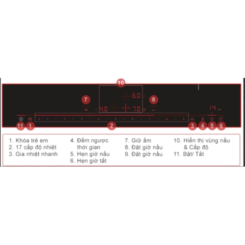 • Vùng nấu 2 (Phải phía trên): Công suất 1400W với đường kính Ø145mm, phù hợp cho các nồi vừa và nhỏ.