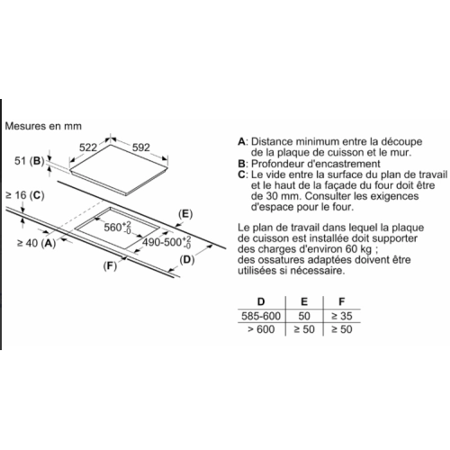 • Độ dày mặt bếp tối thiểu: 16 mm