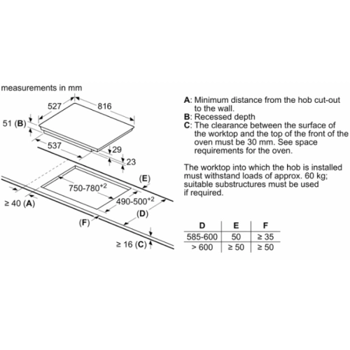 • Kích thước cắt đá: 750-780R x 490-500S x 51C mm