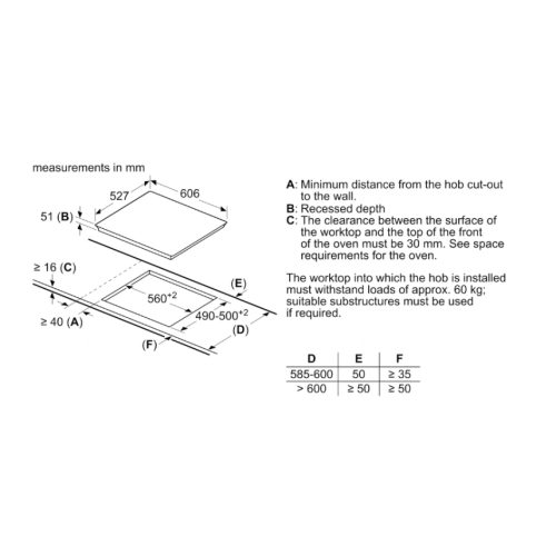 Kích thước sản phẩm được thiết kế gọn gàng (606mm x 527mm x 51mm) phù hợp với nhiều kiểu dáng bếp, trong khi kích thước cắt đá (560mm x 490-500mm) giúp việc lắp đặt trở nên dễ dàng hơn.