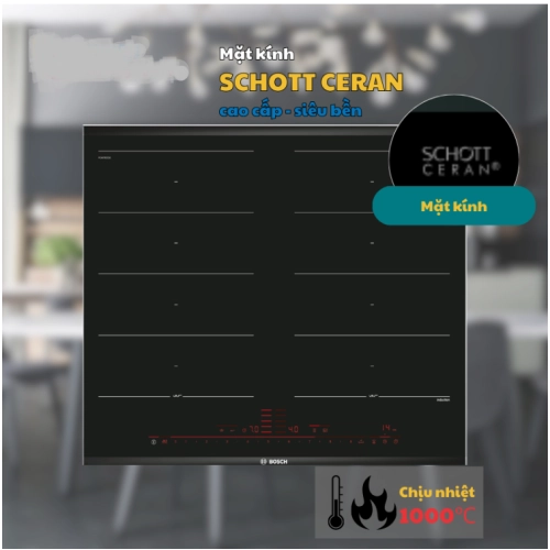 Bếp từ Bosch PXX675DC1E sở hữu mặt kính Schott Ceran cao cấp, được sản xuất tại Đức - nổi tiếng với độ bền vượt trội, khả năng chịu lực và chịu nhiệt tốt. Bề mặt kính không chỉ sáng bóng, tinh tế mà còn dễ dàng vệ sinh sau khi nấu nướng, giúp không gian bếp luôn sạch sẽ và hiện đại.