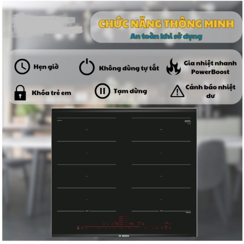 Bếp từ Bosch PXX675DC1E Series 8 được trang bị nhiều tính năng bảo vệ an toàn cho người sử dụng, đặc biệt phù hợp với gia đình có trẻ nhỏ: