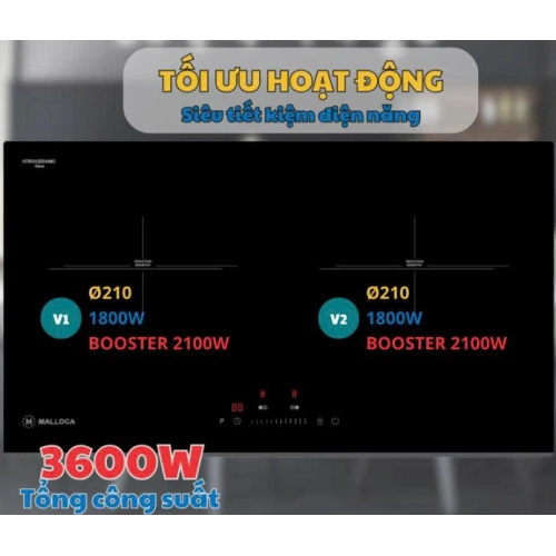 Bếp từ Malloca MH-732 IN được trang bị 2 vùng nấu với tổng công suất lên đến 3.6 kW, đáp ứng nhu cầu nấu nướng đa dạng. Mỗi vùng nấu có công suất 1.8 kW, và khi kích hoạt chức năng Booster, công suất có thể tăng lên 2.1 kW, giúp nấu ăn nhanh chóng, đặc biệt phù hợp với các món cần nhiệt độ cao như xào, chiên. Đường kính vùng nấu Ø210mm phù hợp với nhiều kích thước nồi, chảo khác nhau.