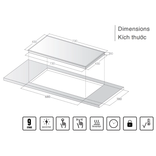 • Kích thước mặt kính: 730R x 430S x 60C mm