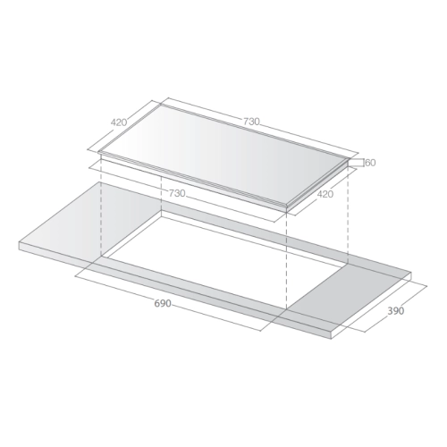 - Kích thước mặt kính: 730R x 420S x 60C mm